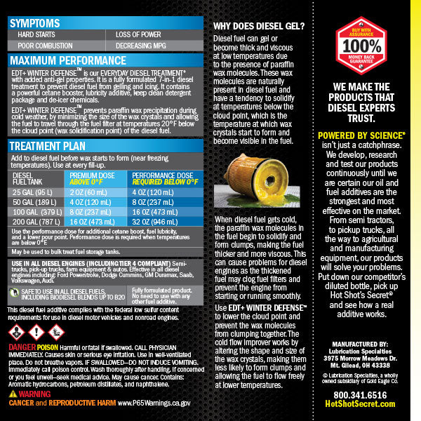 EDT+ Winter Defense is our everyday diesel treatment with added anti-gel properties. It is a fully formulated 7-in-1 diesel treatment to prevent diesel fuel from gelling and icing. It contains a powerful cetane booster, LX4 lubricity additive, keep-clean detergent package and de-icer chemicals.